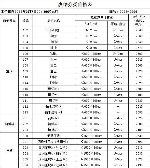 *月*日起,馬鋼誠興本部鋼筋切粒、圓沖子上調**元/噸,工業(yè)重廢毛料、紅沖料、低硫廢鋼、普通打包用廢鋼Ⅱ、優(yōu)質重廢毛料、優(yōu)質重廢C毛料、剪切料毛料、精選毛料、船板毛料上調**元/噸,其他品種價格不變,調整后:重廢毛料最高****元/噸,圓沖子最高****元/噸,鋼筋切粒最高****元/噸,低硫廢鋼最高****元/噸,紅沖料最高****元/噸,工業(yè)重廢毛料最高****元/噸,工業(yè)重廢Ⅱ毛料最高****元/噸,普通打包用廢鋼Ⅱ最高****元/噸,破碎廢鋼*毛料最高****元/噸,破碎廢鋼Ⅱ最高****元/噸,優(yōu)質重廢毛料最高****元/噸,優(yōu)質重廢C毛料最高****元/噸,剪切料毛料最高****元/噸,精選毛料最高****元/噸,刨花毛料最高****元/噸,船板毛料最高****元/噸,冷板毛料最高****元/噸。以上價格不含稅。