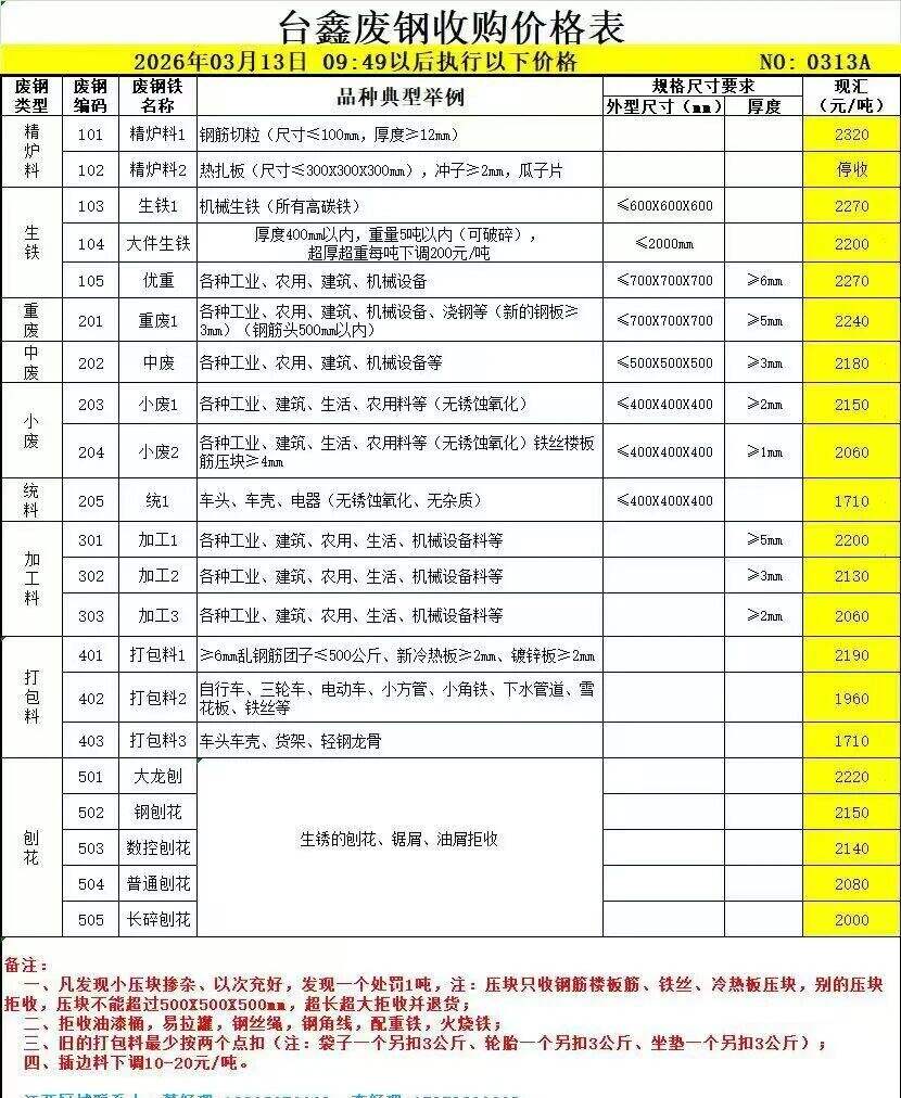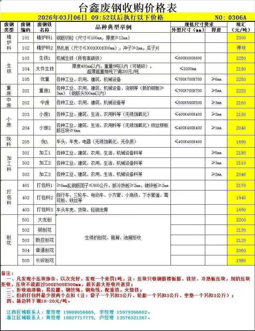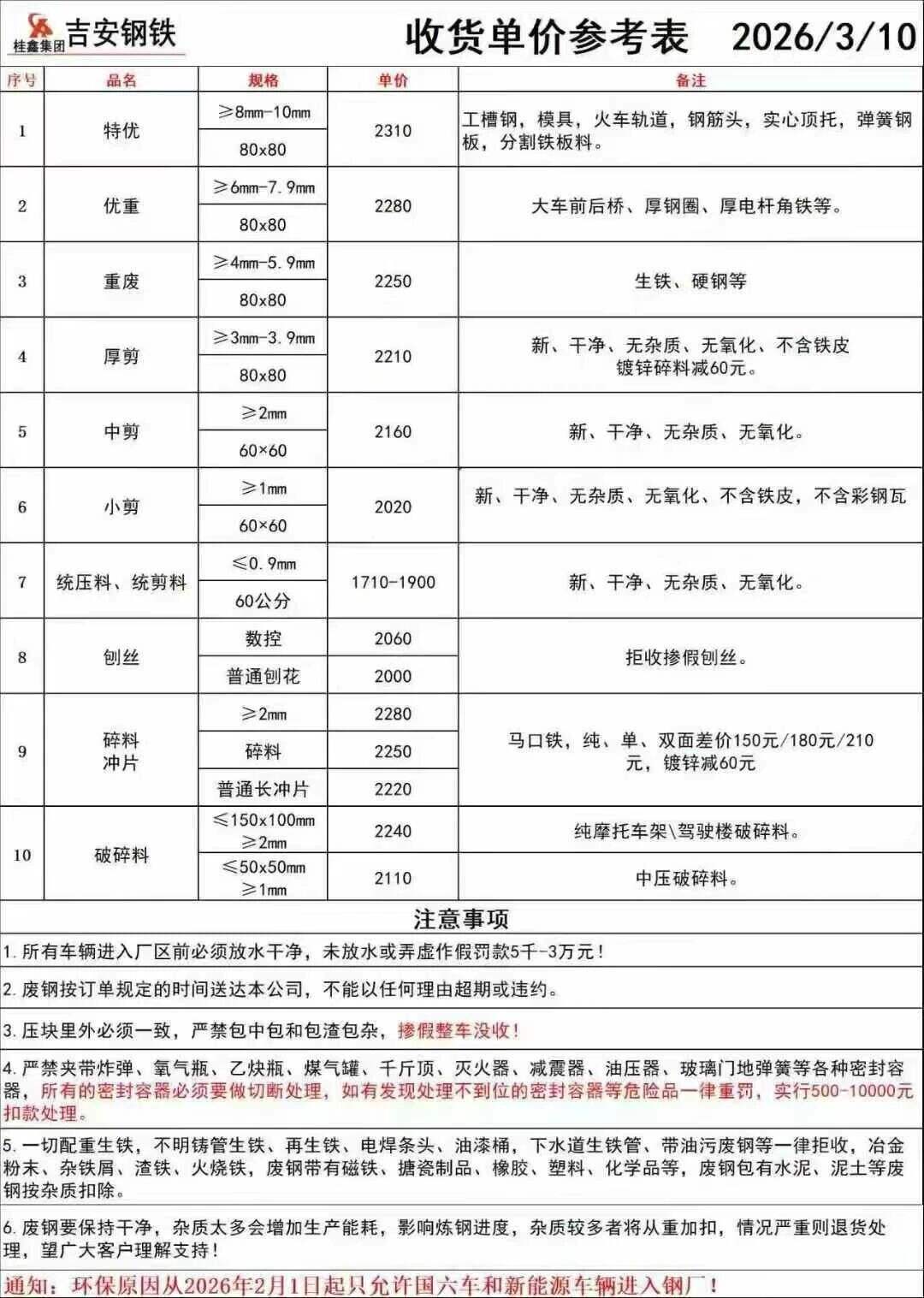 江西九鋼:自****年*月*日起:汽運:鋼筋壓塊、邊角料壓塊*、冷熱軋鍍鋅壓塊*、邊角料壓塊*、冷熱軋鍍鋅壓塊*下調(diào)**元/噸,一級廢鋼壓塊A、二級廢鋼壓塊下調(diào)**元/噸,汽車輪胎鋼絲下調(diào)**元/噸,其余品種價格不變。船運:新定清潔壓塊價格為****元/噸,其余品種價格不變。
