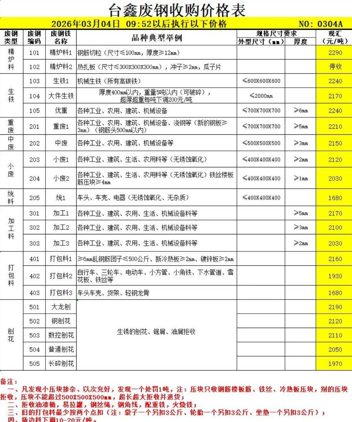 湖口宏鑫(九江萍鋼一手合同戶)****年*月*日價格調(diào)整如下:*;鋼筋壓塊:*****;冷熱軋壓塊*、邊角料壓塊一;*****;冷熱軋壓塊*、邊角料壓塊二;*****;普通壓塊:*****;巖棉壓塊:*****;汽車輪胎絲:*****;一級廢鋼壓塊:*****;二級廢鋼壓塊;****所有扣雜判檢以鋼廠為準(zhǔn),有弄虛作假,沒收,罰款等情況由客戶自行承擔(dān)。