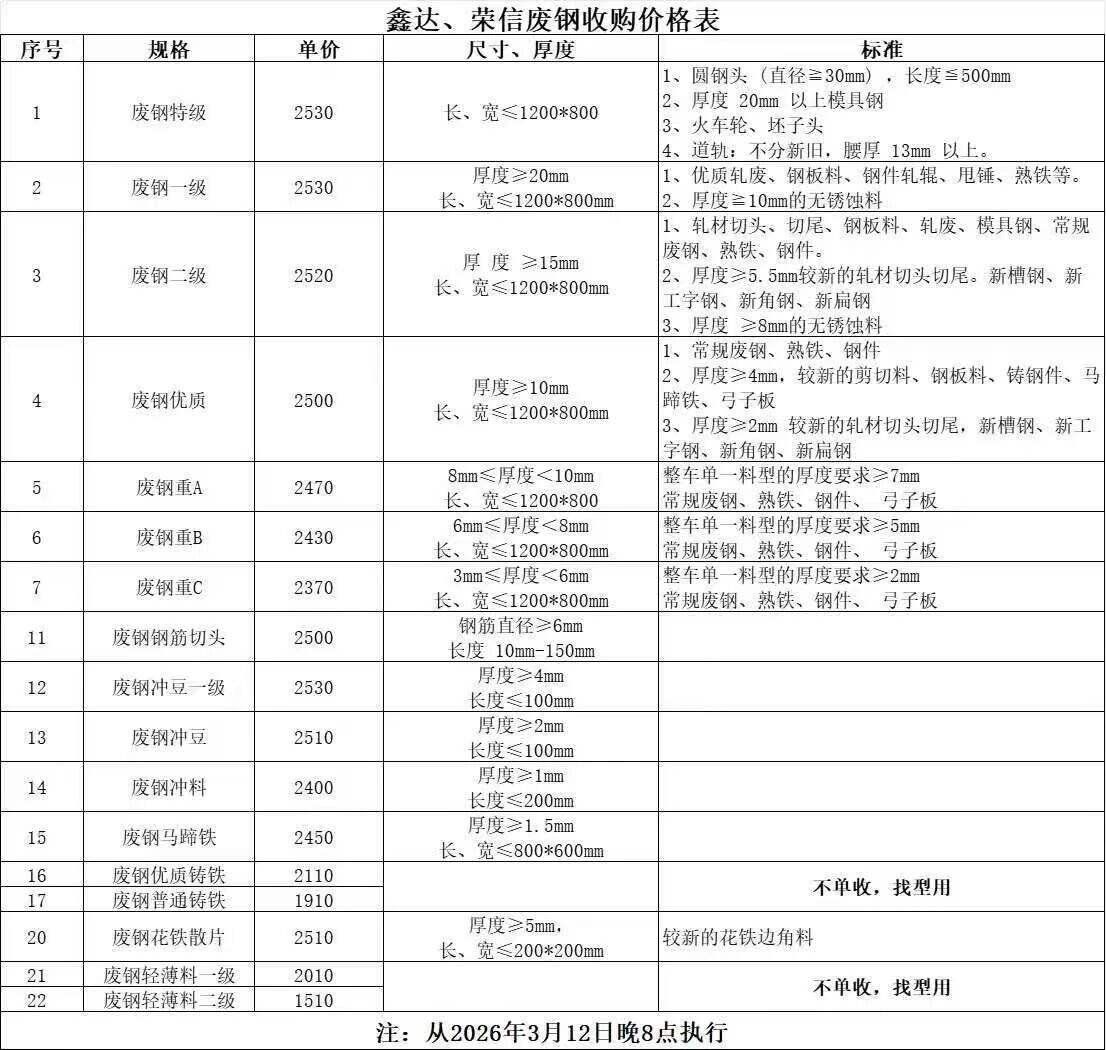 **日張宣科技廢鋼最新執(zhí)行價格:重型****-****,中型****,小型****,輕料****,不含稅。