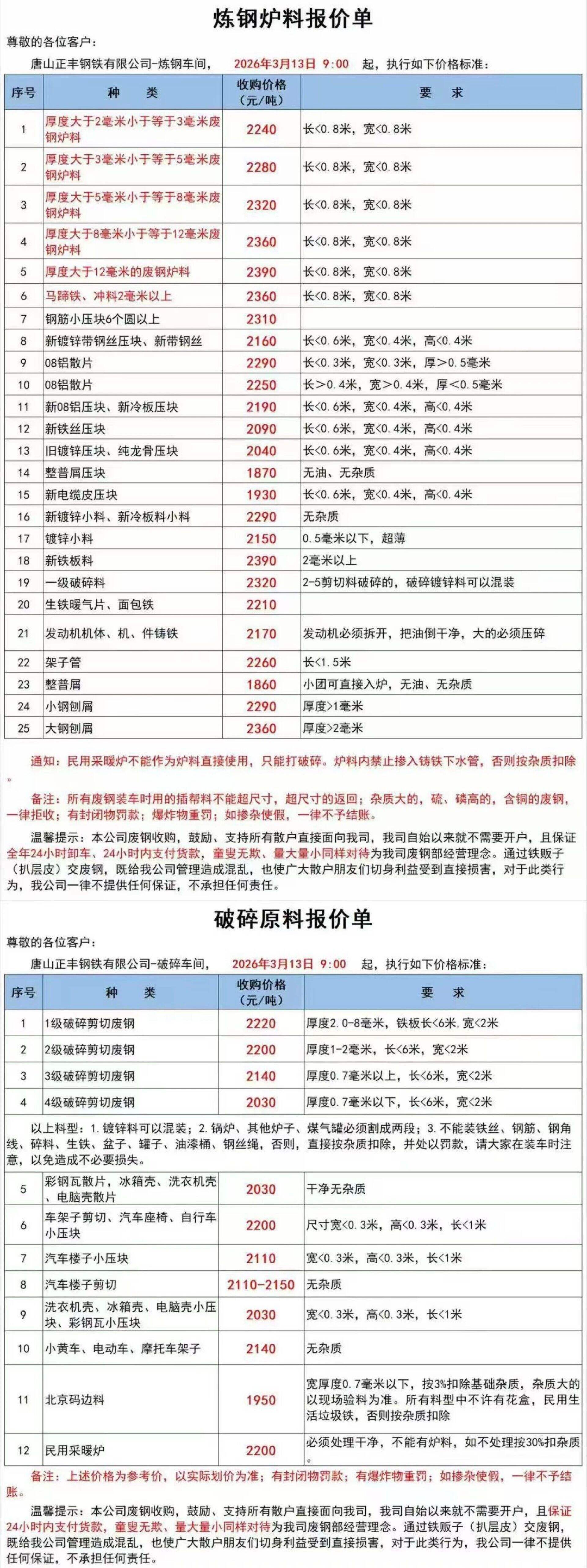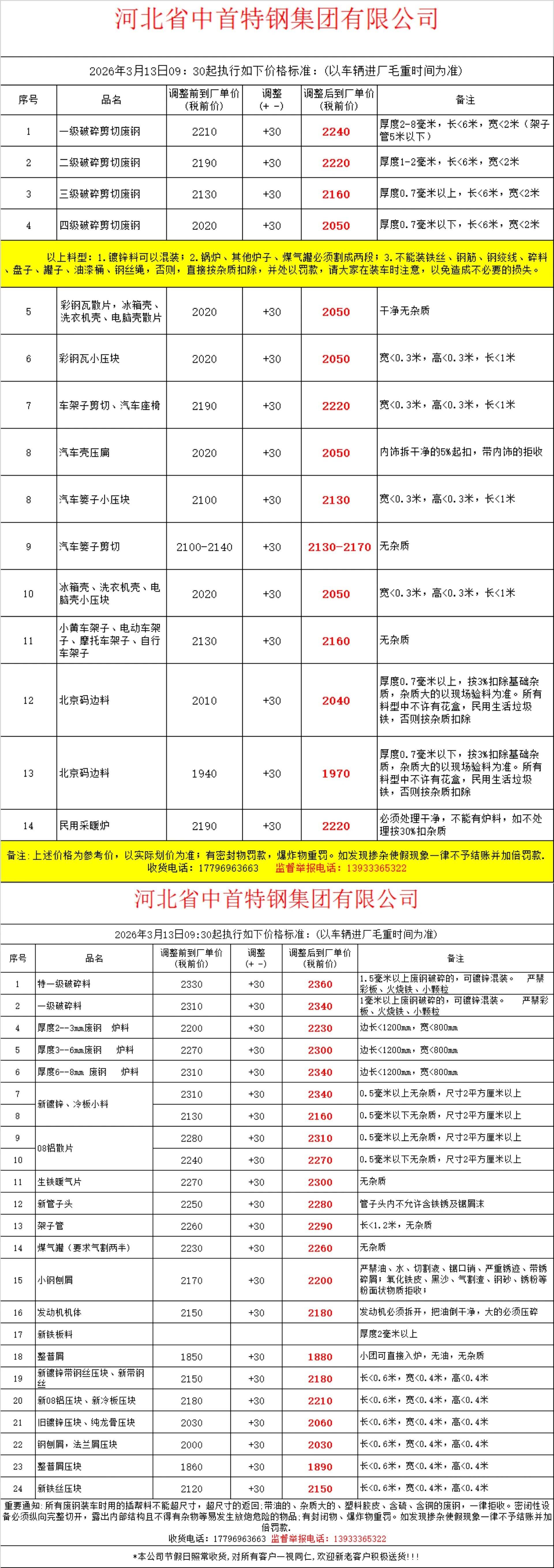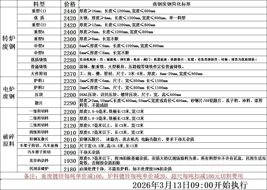 汽車底盤酸洗板*.*,精品打包塊*.*,**鋁散片*.*,精品打包塊*.*,小型加工廢鋼*.*,精品打包塊*.*,新鐵板料*.*,普通打包塊*.*上調(diào)**元/噸;中、重廢類上調(diào)**元/噸,其他料型不做調(diào)整。執(zhí)行時間****