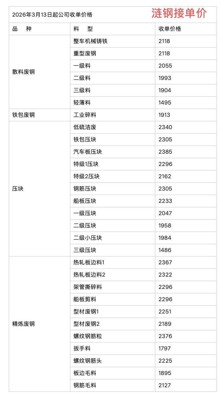 各等級廢鋼普漲**元/噸(不含入爐散料廢鋼),鐵水罐壓塊一****元/噸,特級壓塊二****,一級壓塊****